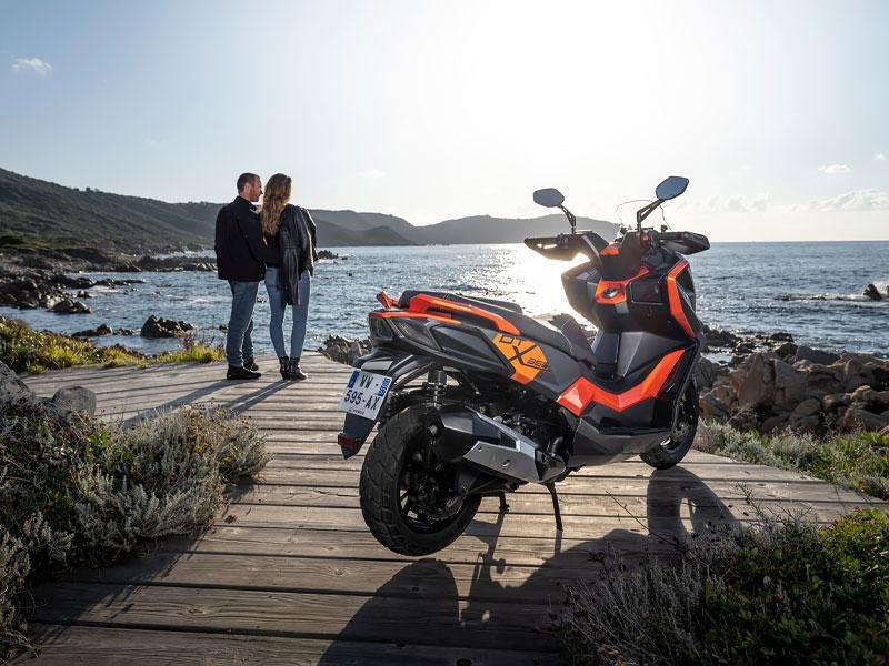 The DT X360’s major point of reference is based on its ‘adventure’ credentials, which includes 14- and 13-inch aluminium-alloy wheels shod with dual-purpose tyres to take on light off-road terrain as part of the machine’s more wide-ranging remit. Other standout features include traction control, a 12.5-litre fuel tank, 800mm seat height – 25mm higher than the Downtown – wide handlebars, keyless ignition, all-LED lighting and a full-colour LED digital screen and two USB ports. Underseat storage is roomy as well: enough to accommodate at least two helmets.